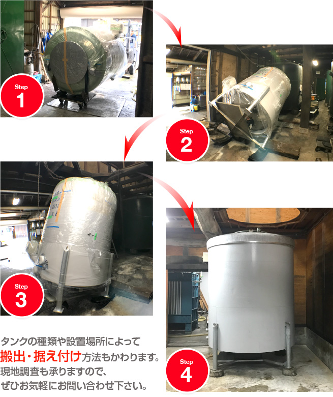 さまざまなタンクの種類をご用意しておりますので、 お目的やご要望などお気軽にお問い合わせください。 機能的で精密なタンクなどは取り扱いや大変難しいものも多く、当社の豊富な経験と技術を活かし、運搬から設置まで、責任を持ってサポートさせていただきます。